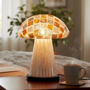 Lampe à poser en fibre de verre effet mosaïque aux tons nacrés et dorés. Un luminaire décoratif chaleureux au style champignon tendance.