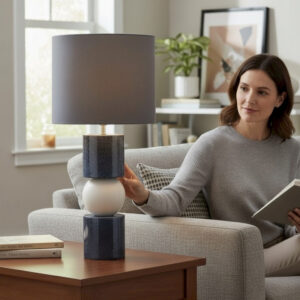 Lampe à poser design en céramique grise avec sphère blanche centrale et abat-jour en tissu gris. Une pièce élégante et moderne.