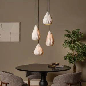 Suspension Cinzia en porcelaine à motifs ondulés, 4 abat-jours E27, hauteur réglable et ambiance élégante.