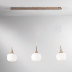Suspension Jaipur 3 lumières en métal bois et verre opale blanc, pavillon 87 cm, idéale pour table ou îlot central.