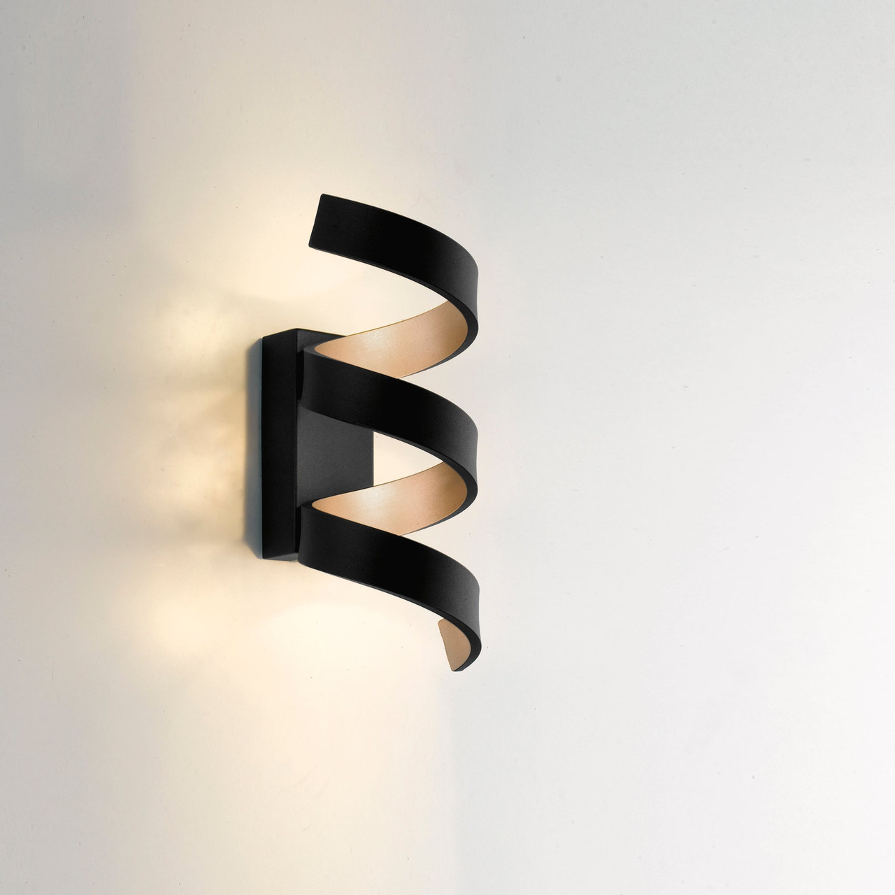 Son design s’inspire d’une hélice en rotation. Ainsi, la bande métallique noire s’enroule autour d’un axe et révèle un intérieur doré lumineux. Cette forme dynamique crée un contraste subtil entre ombre et lumière. De plus, même éteinte, l’applique apporte du relief à votre mur et devient un élément décoratif à part entière.