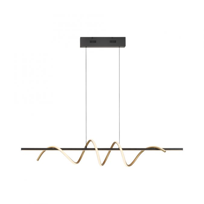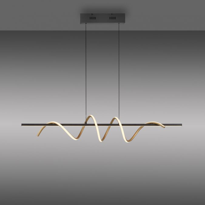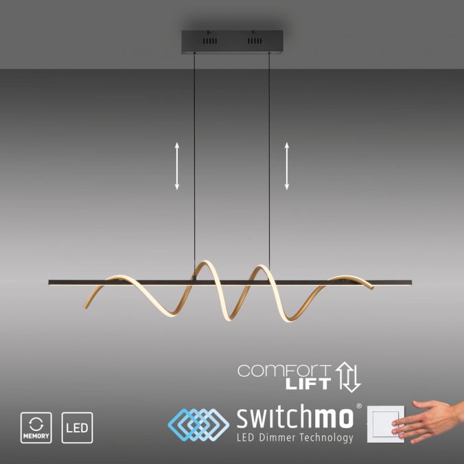 Suspension LED élégante noir et laiton, hauteur réglable avec Comfort Lift et variation d’intensité à 3 niveaux.