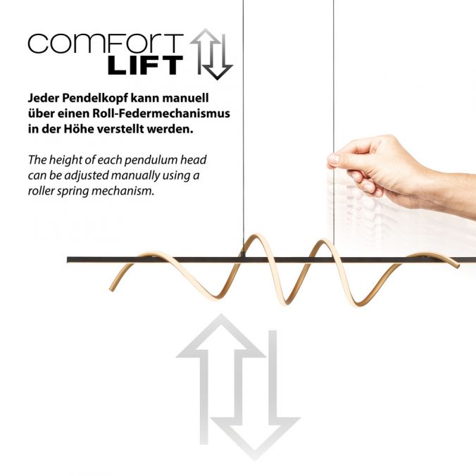 La suspension dispose d’un système de réglage en hauteur innovant et fiable. Grâce au Comfort Lift, ajuster la lampe devient simple et pratique. Il n’y a plus de câbles encombrants ni de contrepoids visibles. Vous adaptez la hauteur à votre table ou à la pièce en quelques secondes, pour un rendu parfaitement harmonieux.