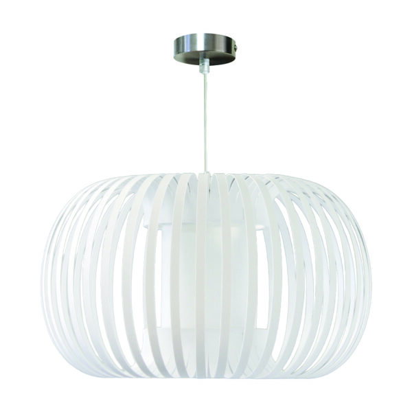 Suspension Esteno D38 cm blanc. Design léger à structure ajourée, diffuseur blanc et lumière douce. Compatible ampoule E27 pour un éclairage modulable.