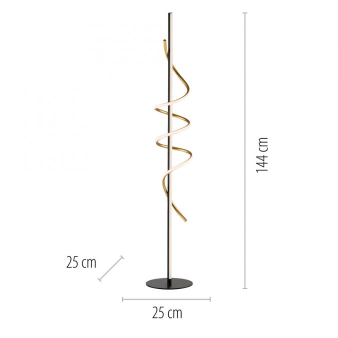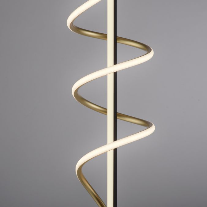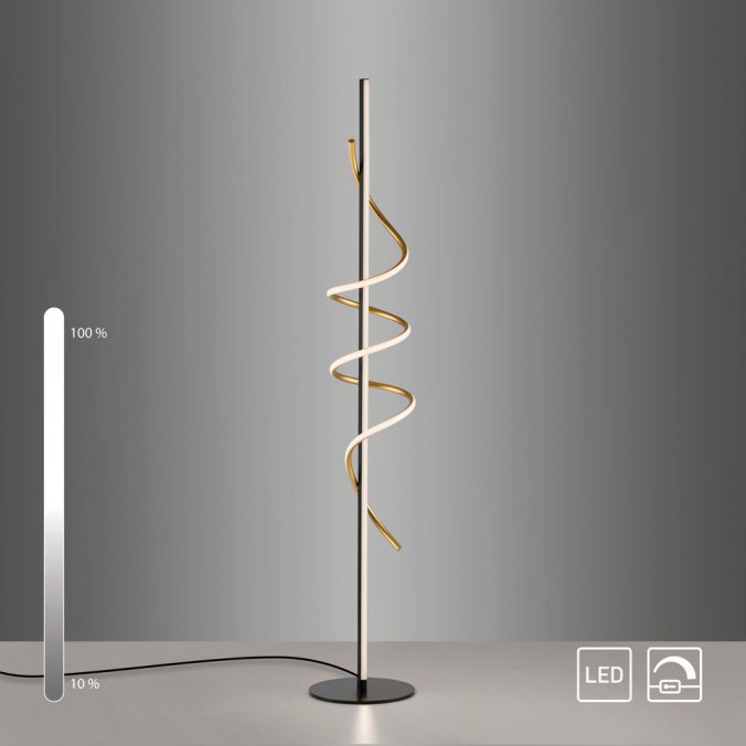 Lampadaire LED torsadé noir et laiton, lumière blanc chaud 3000K et variateur sur cordon pour une ambiance sur mesure.