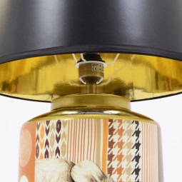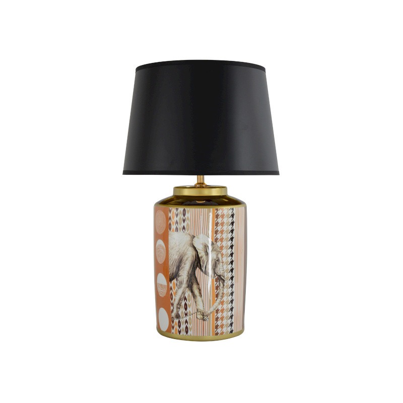 Lampe à poser décorative avec motif éléphant et finitions dorées, surmontée d’un abat-jour noir élégant. Une pièce graphique et originale.
