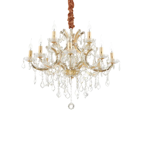 Dès l’installation, cette suspension transforme l’espace. Le métal doré apporte luxe et chaleur, tandis que les pampilles de cristal diffusent la lumière de façon délicate. Chaque détail est pensé pour sublimer le volume. Avec ses douze sources en douille E14 (non incluses) vous maîtrisez l’ambiance. ideal-lux.com+1