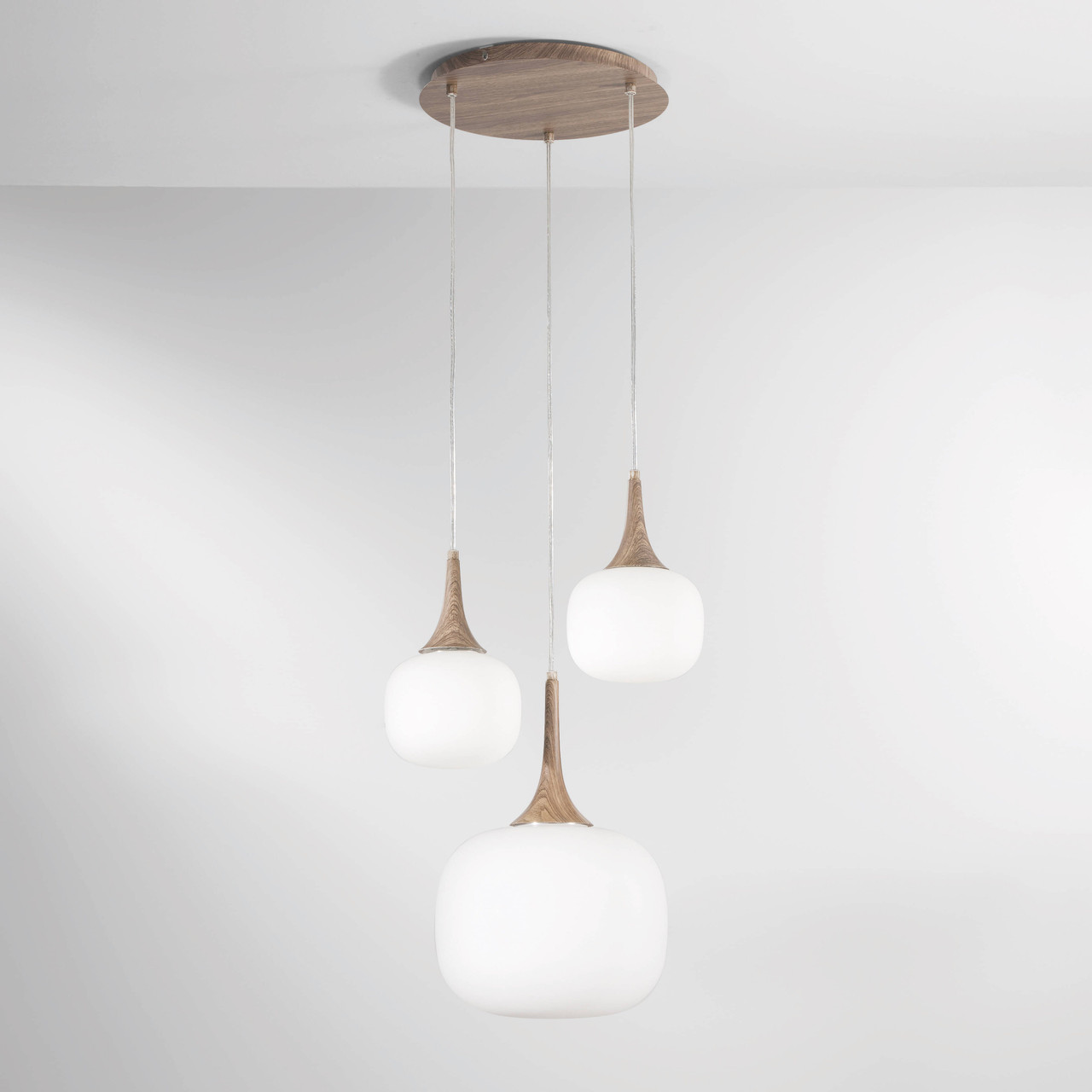 Suspension Jaipur 3 lumières avec pavillon rond Ø29 cm et verres opale de tailles différentes, élégante et chaleureuse.