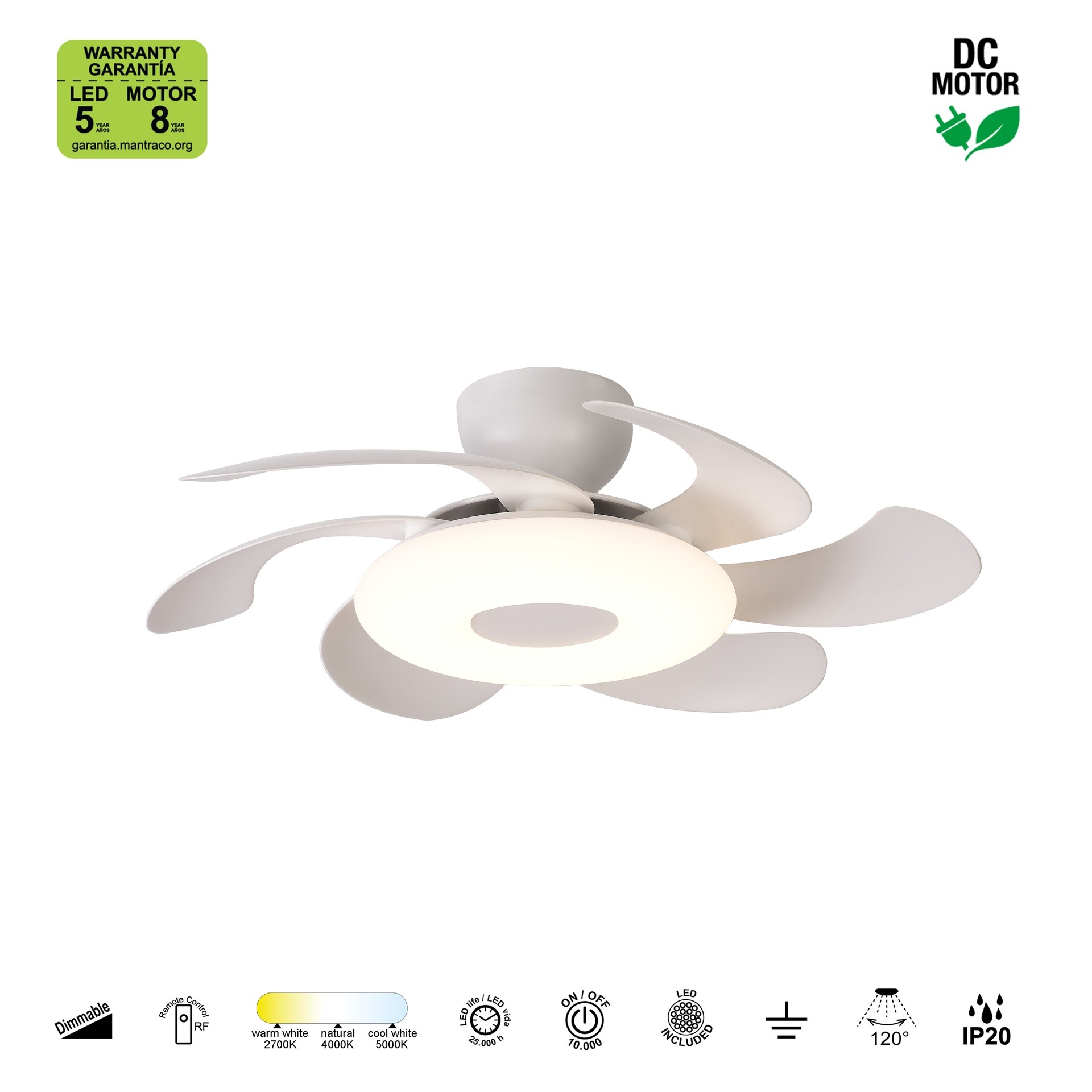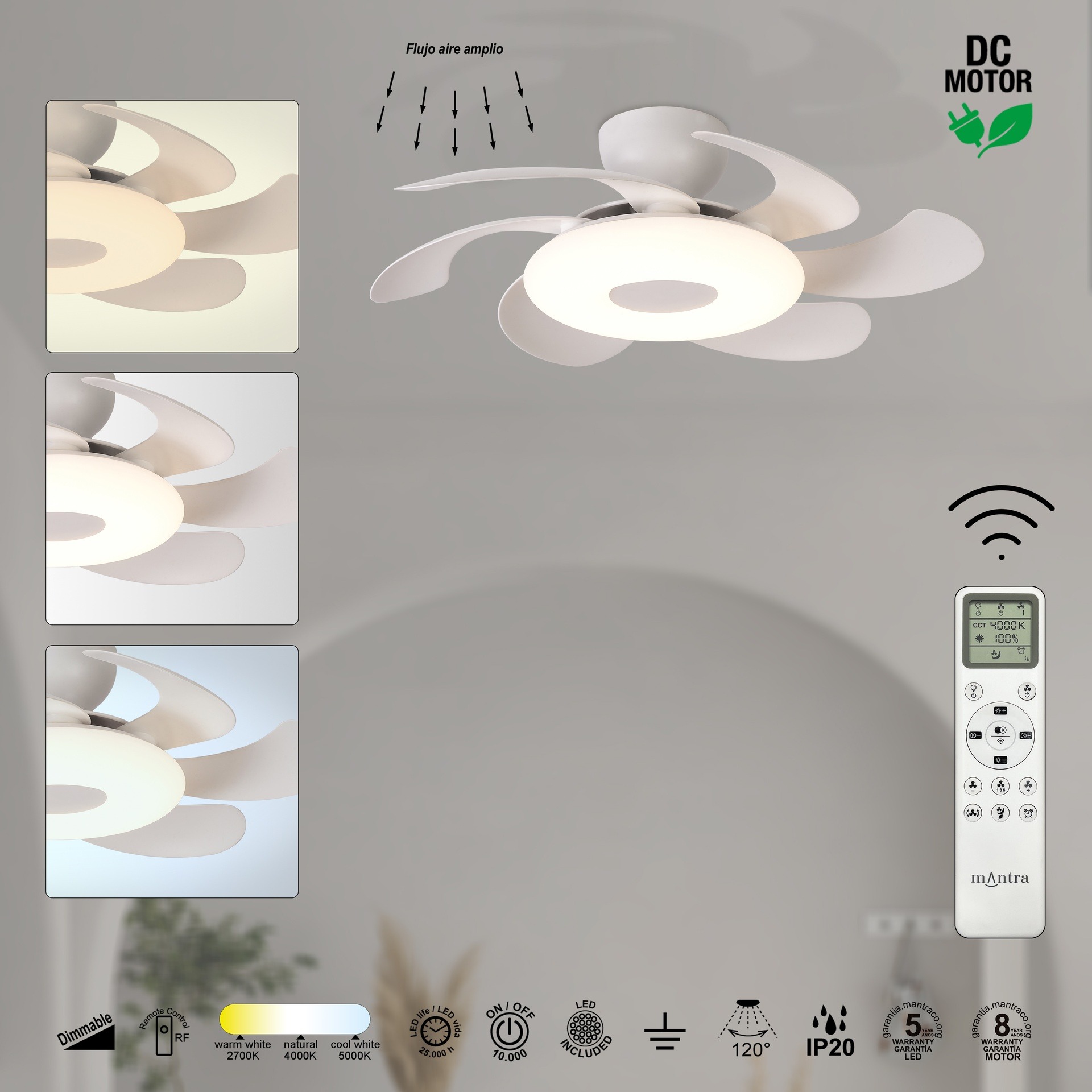Ce ventilateur plafond design avec lumière intègre un éclairage LED performant et adaptable. Il permet de régler l’intensité lumineuse ainsi que la température de couleur, allant d’une lumière chaleureuse à une lumière plus dynamique. Cette flexibilité vous permet de créer différentes ambiances selon les moments de la journée et les usages de la pièce.